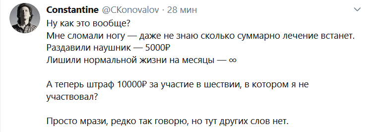 Савеловский суд Москвы оштрафовал на десять тысяч рублей дизайнера Константина Коновалова, которому полицейские сломали ногу перед началом несогласованного митинга за честные выборы 27 июля. Об этом «МБХ медиа» сообщили в пресс-службе суда. (Отсюда.)