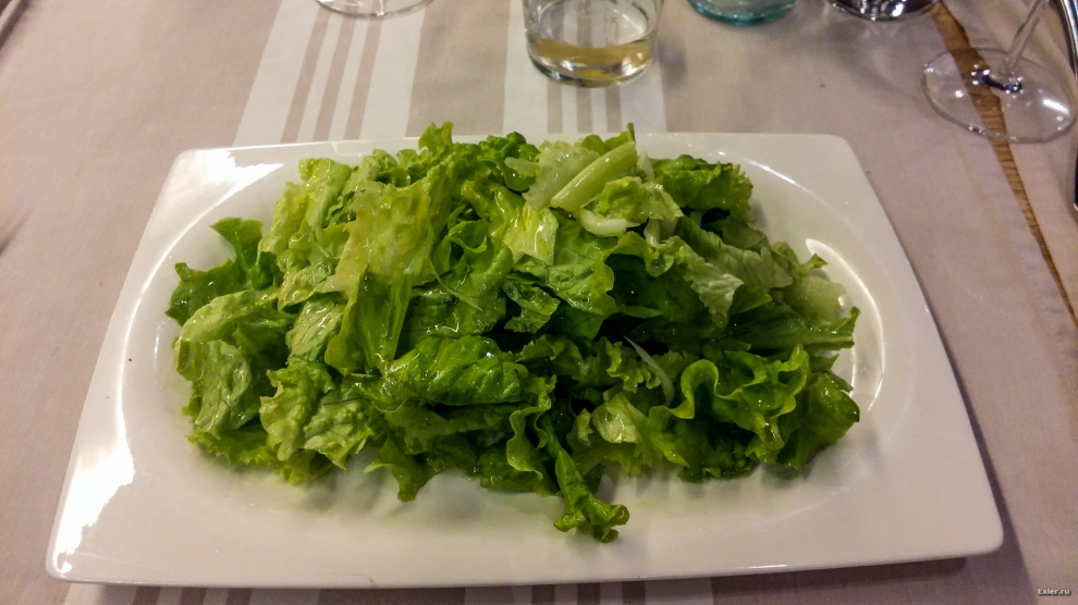 Салат из листьев салата. Казалось бы, блюдо - проще не бывает. А вкусно обалденно. Потому что салат заправляется хитрой смесью оливкового масла, специй и яблочного уксуса, сделанного из сидра. Получается обалденное блюдо.