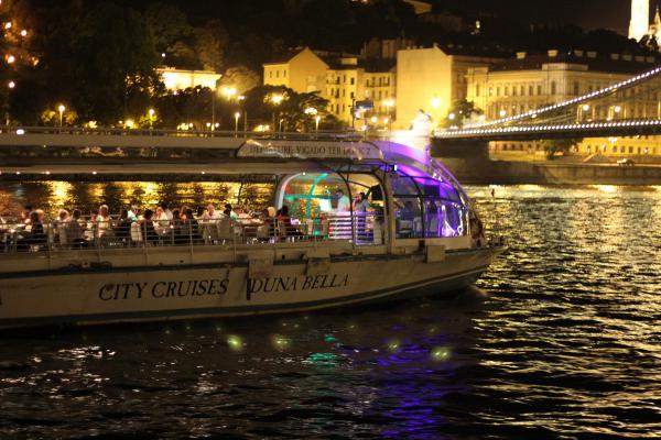 Навстречу попался вот такой вот забавный кораблик. Люди на нем вместо того чтобы смотреть по сторонам, чинно смотрят в телевизоры - слушают гида. Прикольное времяпрепровождение во время ночной поездки по Дунаю.