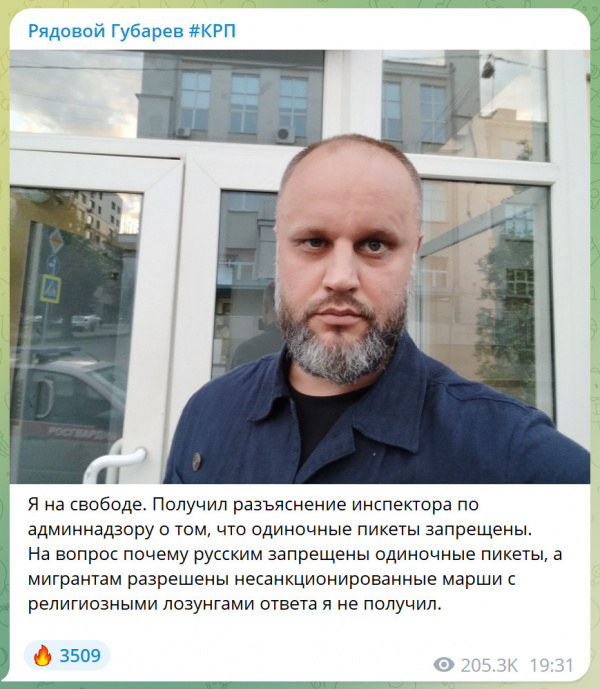 Кстати, Губарева, ясный пень, быстро отпустили - на хрен он там кому вообще сдался, и Губарев стал недоумевать у себя в ТГ. Может, мы ему подскажем, почему русским запрещено, а мигрантам разрешено, а? А то в непонятках человек, удивляется.