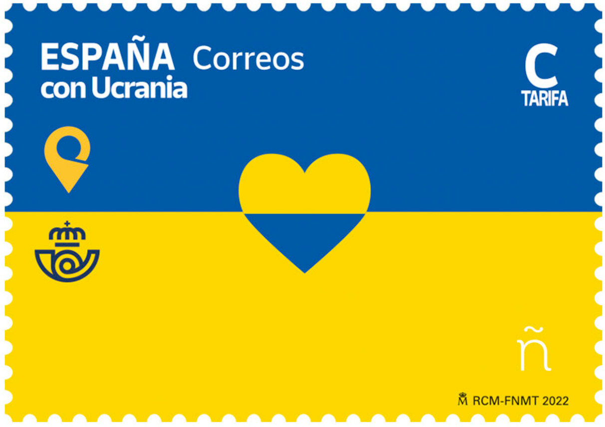 Синий и желтый цвета, которые также присутствуют на марке, посвященной Украине, заполнили балконы и улицы нашей страны в поддержку народа, страдающего от жестоких последствий войны. В левом верхнем углу - слова "Испания с Украиной" рядом с двумя официальными логотипами почтовых операторов обеих стран.