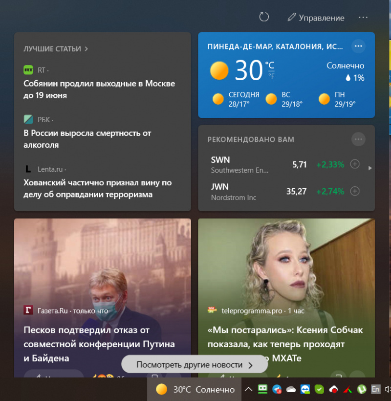 Если нажать на панель, то появится блок новостей из различных изданий. Тематику новостей теоретически можно настраивать, но мои опыты показали, что все равно пихают подборку по каким-то своим алгоритмам. Однако какие-то издания в настройках можно исключать, и это работает.