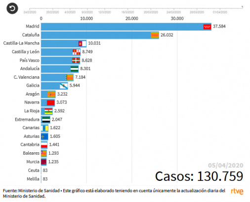 Министр здравоохранения Испании заявил, что страна находится на стадии замедления распространения эпидемии. Полученную из других стран помощь в количестве 28 миллионов масок и 1,5 тысячи аппаратов ИВЛ министерство распределило в наиболее нуждающиеся области.