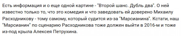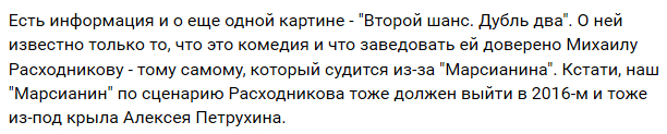 Собственно, я, конечно, плевал на всякие расходные материалы, меня-то в этой новости заинтересовало то, что наш "Марсианин" должен выйти из-под крыла Петрухина. Представляю себе этот шедевр. В пику, так сказать, Ридли Скотту.