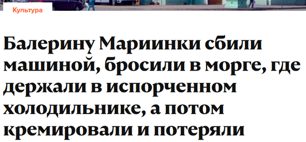 Это неправильный заголовок. Сейчас принято делать заголовки без единого знака препинания, например: "Сбитая машиной и брошенная в морге балерина Мариинки после содержания в испорченном холодильнике и кремации объявлена потерянной".
