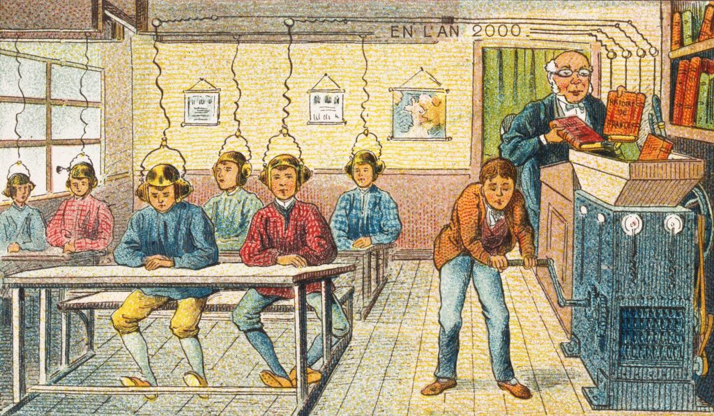 В 1900-м году французский журнал представлял себе школу будущего вот так. Тогдашние мечтатели тоже огорчились бы, узнав, что в наши дни школьная доска, мел и тетрадки вполне в ходу, а географию с алгеброй не загружают прямо в моск электричеством и даже в виде леденцов не дают.