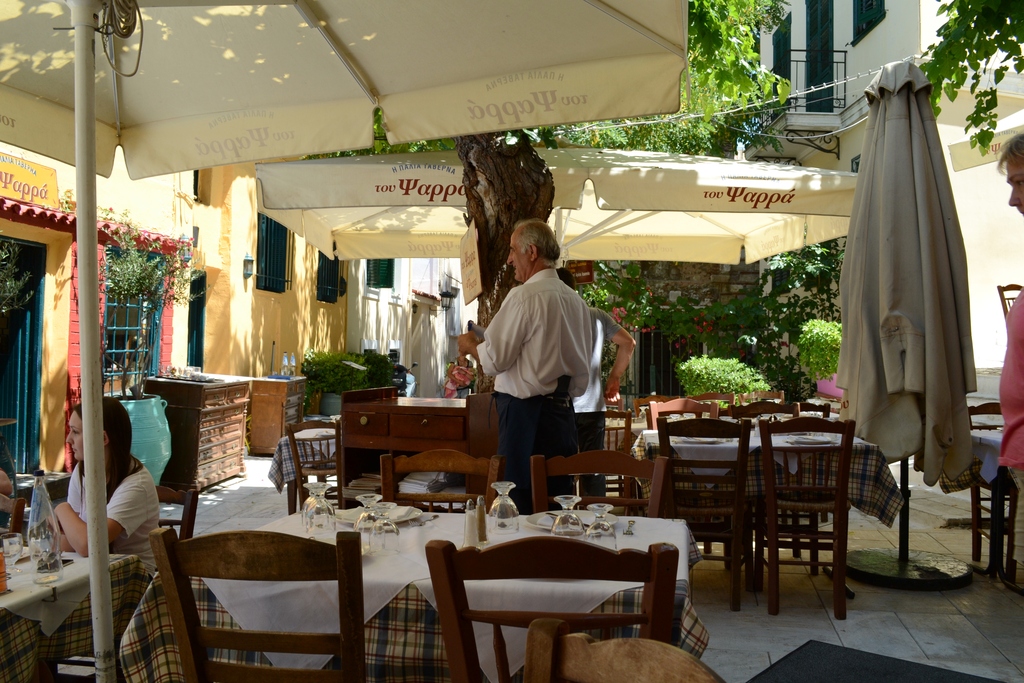 На фото (собственноручном) последний оплот, настоящий живой греческий ресторанчик на тихих старых улочках где-то под Парфеноном. И его гостеприимный хозяин.