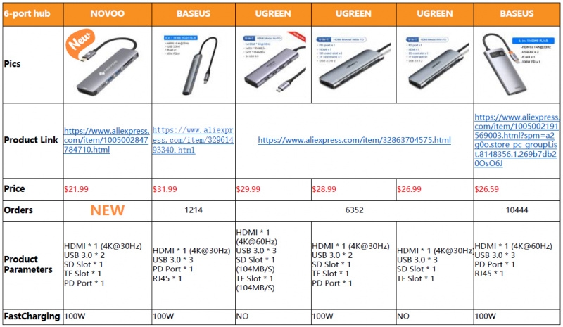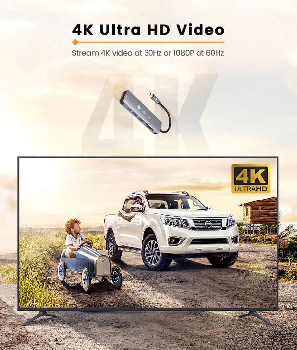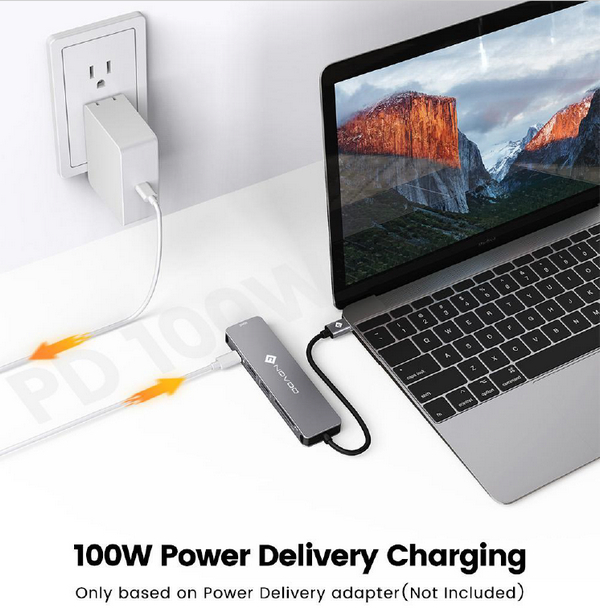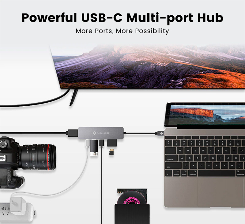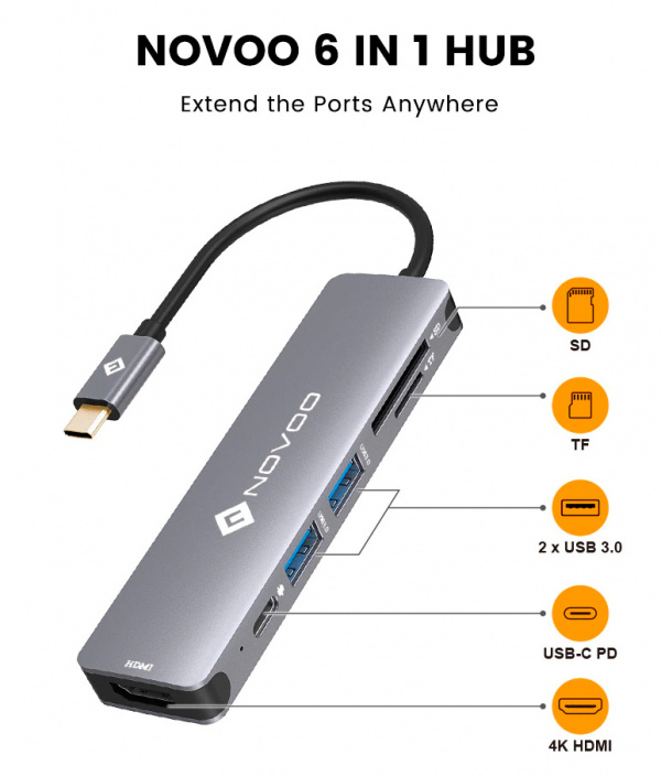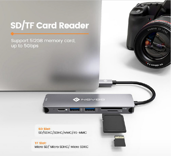 Компания NOVOO представляет новый концентратор "6 в 1", в котором присутствуют: два порта USB 3.0 (до 5 Gbps), порт USB-C с поддержкой Power Delivery, слоты для карт SD и microSD (до 1 TB), порт HDMI с поддержкой видео 4K.