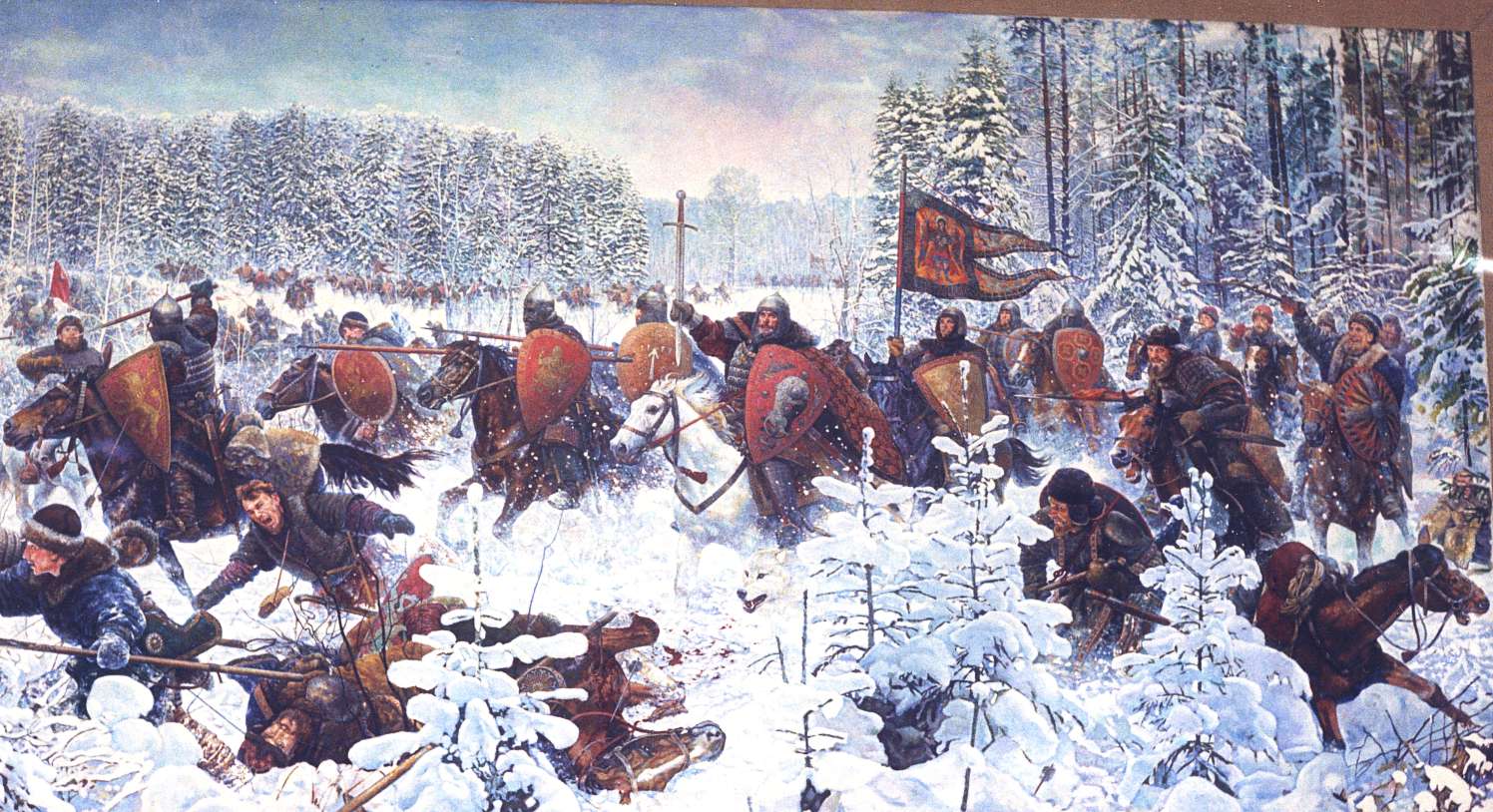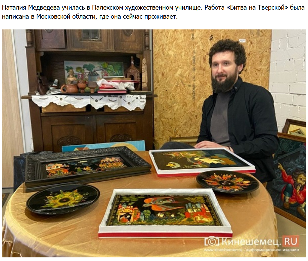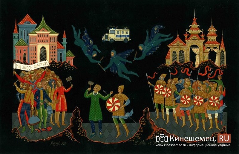 В картине, выполненной в палехском стиле с красноречивым названием «Битва на Тверской» речь идет о событиях в Москве 12 июня 2017 года, когда оппозиционный политик Алексей Навальный вместо согласованной акции на проспекте Сахарова повел сторонников на Тверскую улице, где в это время проходил фестиваль-реконструкция «Времена и эпохи». Это привело к столкновениям и задержаниям, где все смешалось: силовики, оппозиция и ряженые в исторические костюмы фестивальщики. Именно это и изображено на полотне Наталии Медведевой. Зритель видит противостояние двух сторон, столкновение, сражение. С одной стороны безоружный недовольный народ под лозунгом «Мы здесь власть», а с другой стражники, отгородившие толпы людей, в полном обмундировании в шлемах с копьями и щитами. Армия даже не смотрит в сторону народа, она подняла глаза вверх, наблюдая за тремя ангелами. А роли ангелов на кинешемской картине изображены летающие с дубинками омоновцы, именно так их видит автор картины.