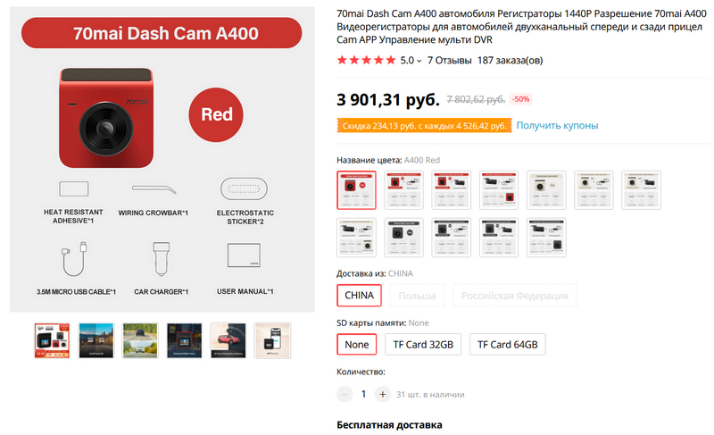 И там есть разные варианты комплектаций: с 70mai Hardware Kit для питания и работы в режиме паркинга, с задней камерой, нескольких видов расцветки и так далее.