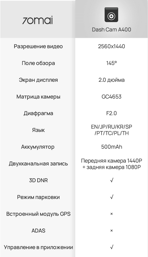 Вот все характеристики. Неплохое разрешение (не 4К, но и не FullHD), есть дисплей (цветной, что почему-то подчеркивается), нет GPS и ADAS, можно укомплектовать задней камерой, русский язык поддерживается.