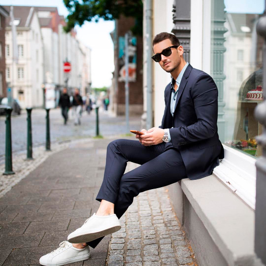 Ходить в джинсах и кроссовках - ок, это нормально. Но костюм носят только с туфлями, и только в носках. То, что на фото - выглядит нелепо.