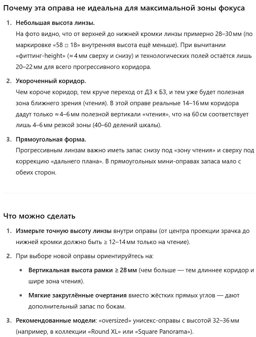 Чтобы увеличить эту ширину, нужно подбирать оправу повыше и линзы с длинным коридором и индивидуальной геометрией.