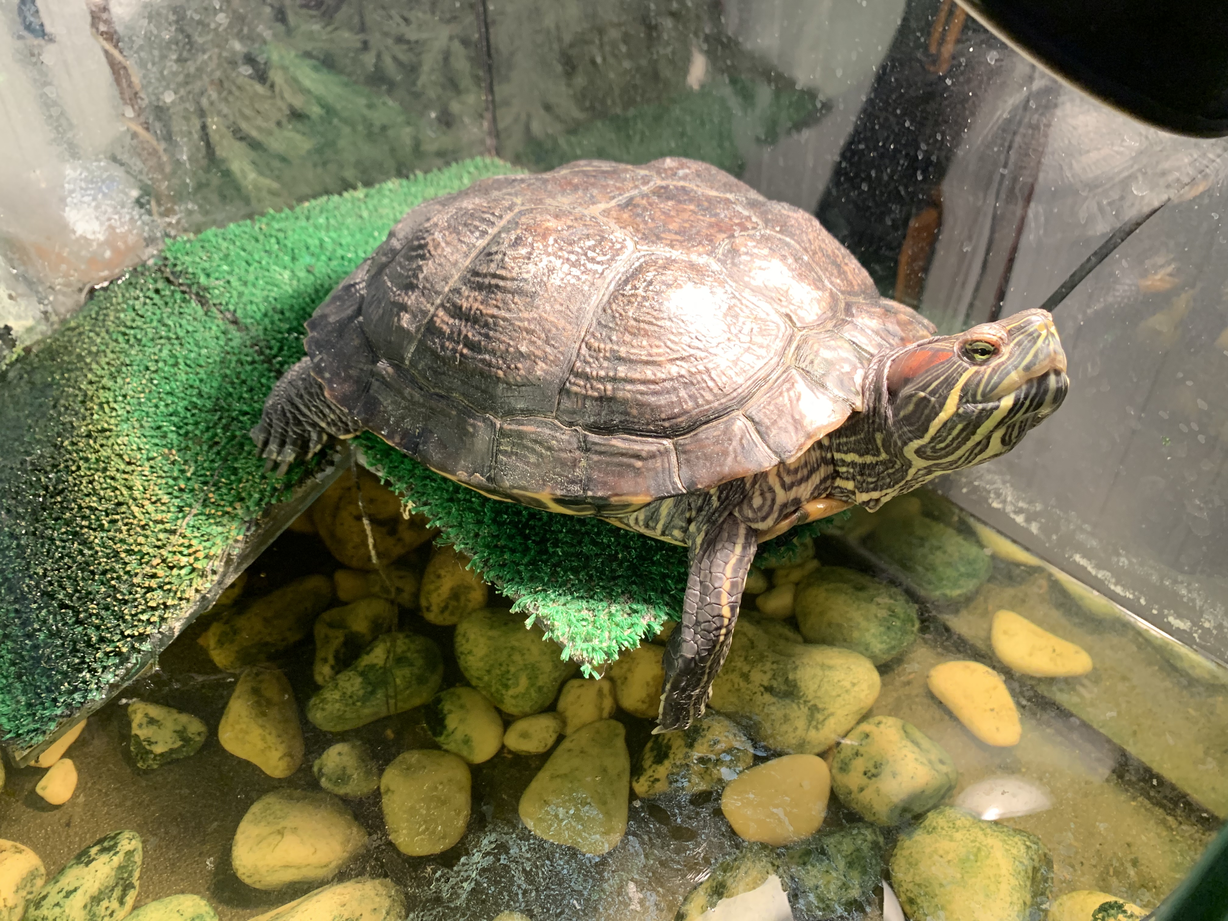 А эта черепашка - агрессивная, ее лучше не злить. Если что - набрасывается на человека и впивается в горло. Видите у нее красная отметка на голове? Тут плакаты висят - этих черепашек-ниндзя лучше не злить.