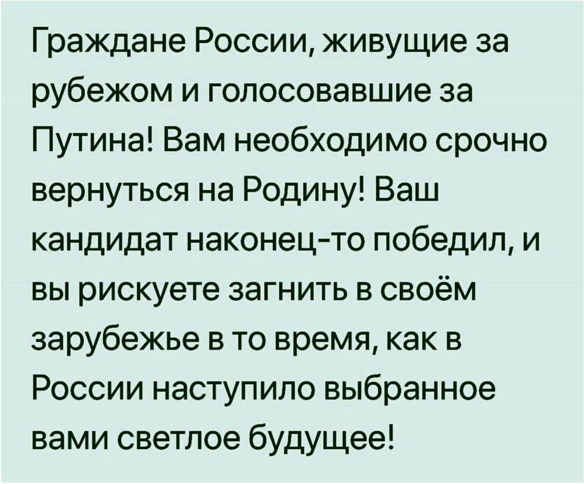 Третьи увольняют за то, что проголосовали за Путина. Да, я считаю что это аморально - во-первых голосовать на российских выборах, живя заграницей, во-вторых - голосовать за Путина. Но это моё мнение, многие видят этот вопрос по-другому.