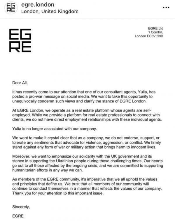 Недавно мы узнали, что один из наших агентов-консультантов Юлия разместила в социальных сетях сообщение в поддержку войны. Мы хотим воспользоваться этой возможностью, чтобы однозначно осудить подобные взгляды и разъяснить позицию EGRE London.