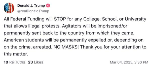 Ну так они будут протестовать вне кампусов. И не только они. И что тогда будет делать Доннифюрер?