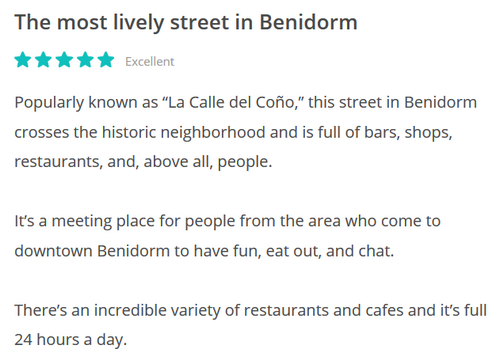Прочитал где-то в Facebook, что в Бенидорме есть улица под названием Coño. Да не может такого быть, подумал я. Coño - это грубое обозначение женского полового органа - аналогии с русским, надеюсь, понятны. Одновременно является очень распространенным ругательством, значение которого меняется в зависимости от контекста. При обращении к мужчине это слово может означать "мудила". Например, классическая фраза, сказанная королем Хуаном Карлосом Уго Чавесу "¿Por que no te callas, coño?", и означает "Почему бы тебе не заткнуться, мудила"?