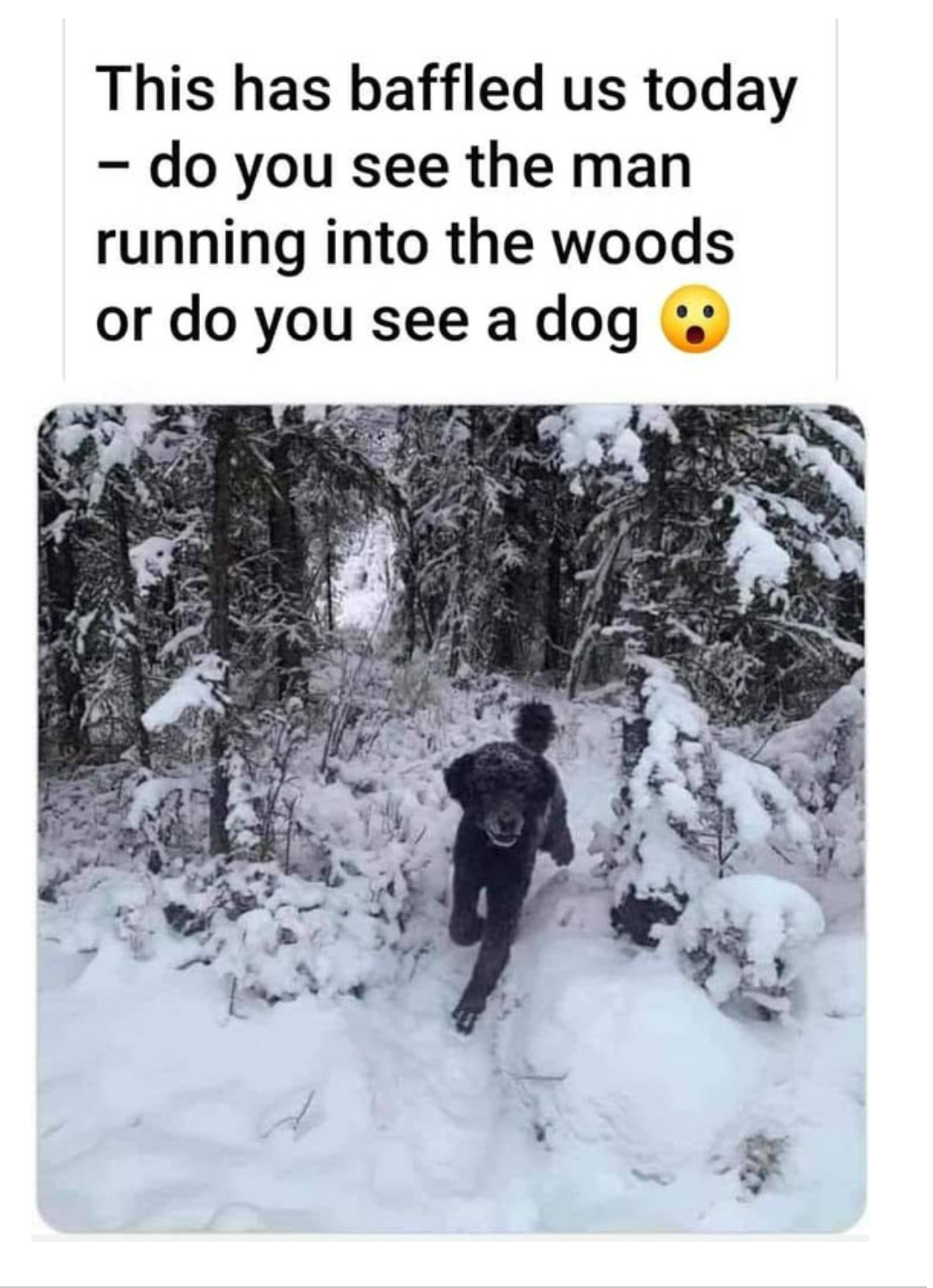 Там вместо человека - чёрный заснеженный пудель, а человеческая якобы "голова" - это хвост. ))