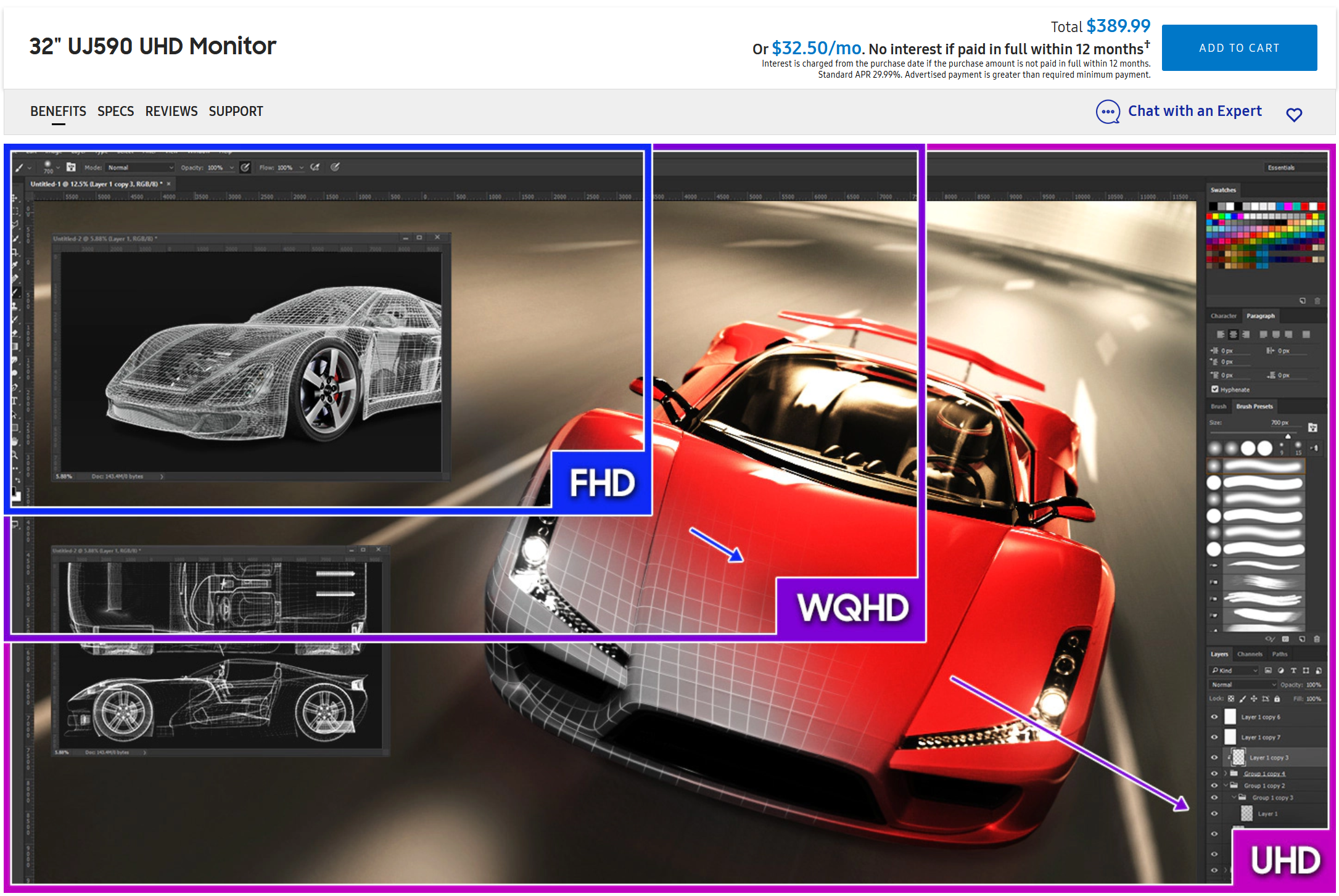 У меня задачи другие, поэтому выбрал 32" Ultra HD (Samsung 32" UJ590) как основной монитор с разрешением 3840x2160, а сверху висит старый 24" (1920x1280) для чатиков.