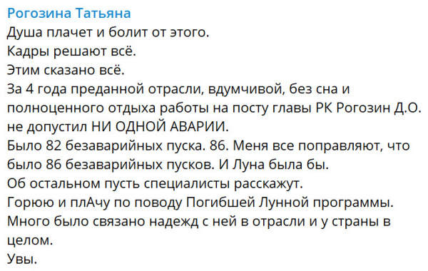 Upd: У Татьяны Рогозиной просто болит душа, просто болит душа! Ведь если бы ее Димку не выперли из Роскосмоса, то он бы счастливо разворовал все средства, отпущенные на "Луну-25", так что позорный запуск просто бы не состоялся! Эх, не подумали они, прям не подумали!