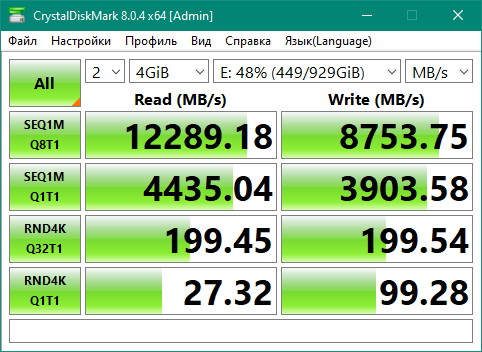 Скорость при записи в районе 900-1000 МБ/с. При чтении 1200 или в этом роде. Доволен.