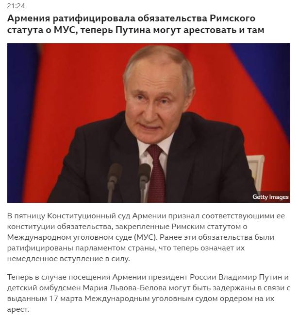 Кстати, Россия, насколько я помню, присоединялась к Римскому статуту Международного уголовного суда. Году в 2015-м, если мне не изменяет память. Присоединялась, но не ратифицировала его. А было бы прикольно, если бы ратифицировала.