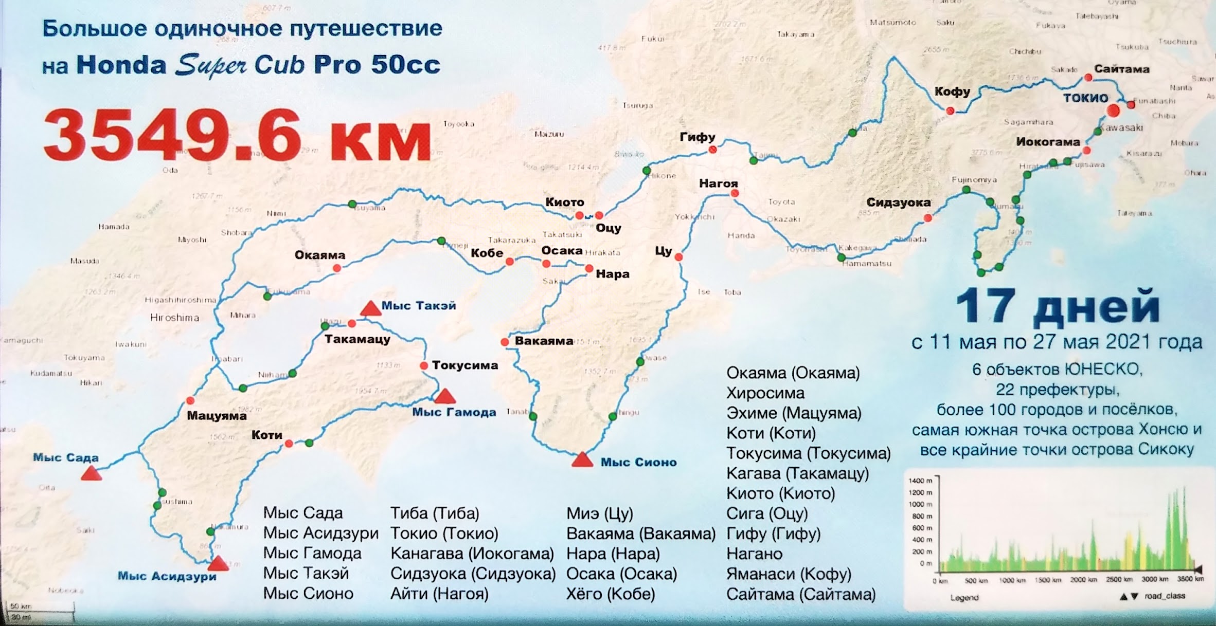 То он "в полном одиночестве я провёл в горах и лесах Японии шестнадцать ночей в палатке", то "пройден путь длинной боле трёх с половиной тысяч километров, который лежал через 22 префектуры и более 100 городов и посёлков".