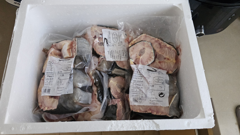 Ну вот и осетрики с фермы Небылицкого очередные приехали - упаковки стейков по одному килограмму. У меня читателей из Испании немало - ловите момент, там сейчас эти стейки предлагают 2 кило за 20 евро, то есть кило стейков из осетра за 10 евро - это прям бесплатно. Я обычно у них ловлю такие спецпредложения и закупаюсь по полной: осетры отлично морозятся, так что у меня в морозилке потом еще несколько месяцев лежат расфасованные упаковки, я их периодически достаю, размораживаю в холодильнике и готовлю.