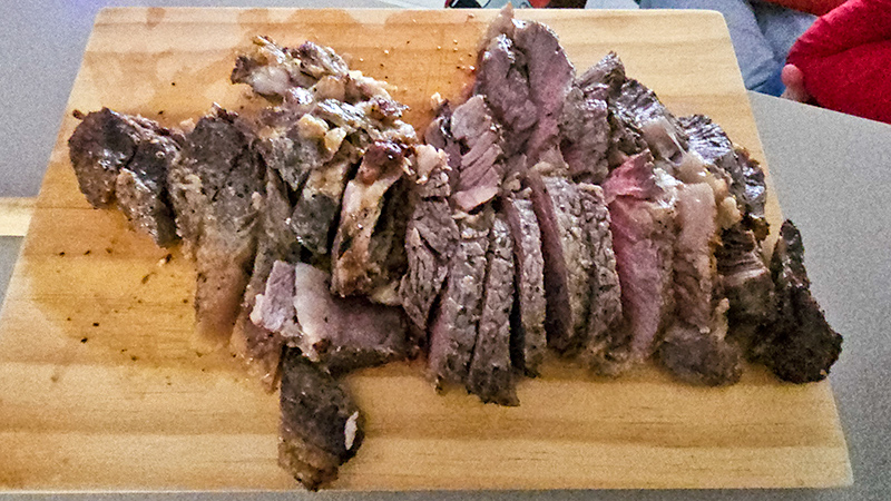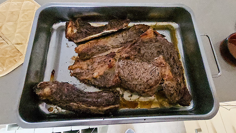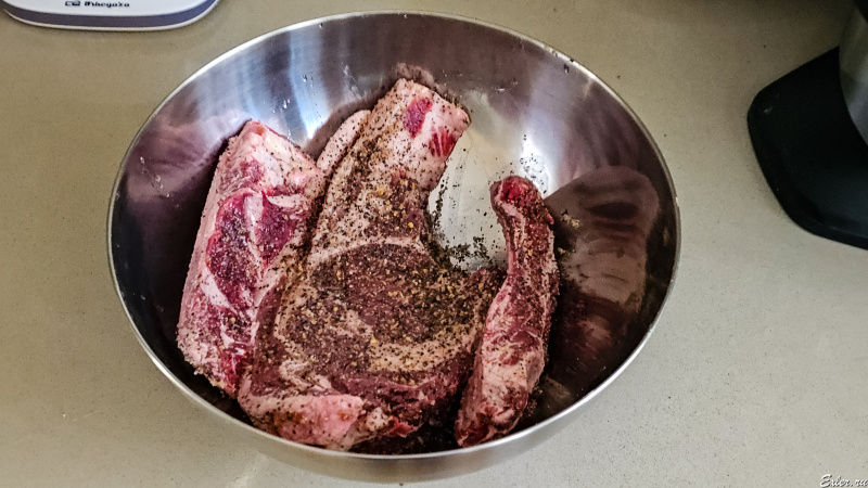 Как обычно, отрезал кость - не люблю готовить с костью, там рядом с костью мясо все равно будет сырое. Поэтому кость отрезал, засыпал монреальской смесью. Постоит несколько часов, после чего как обычно: запечатать по минуте на стороне на сильном огне на сковородке, далее в духовку на 200 градусов и довести до 58 градусов по термометру. Достать, положить здоровенный кусок сливочного масла, накрыть фольгой и дать постоять минут десять.