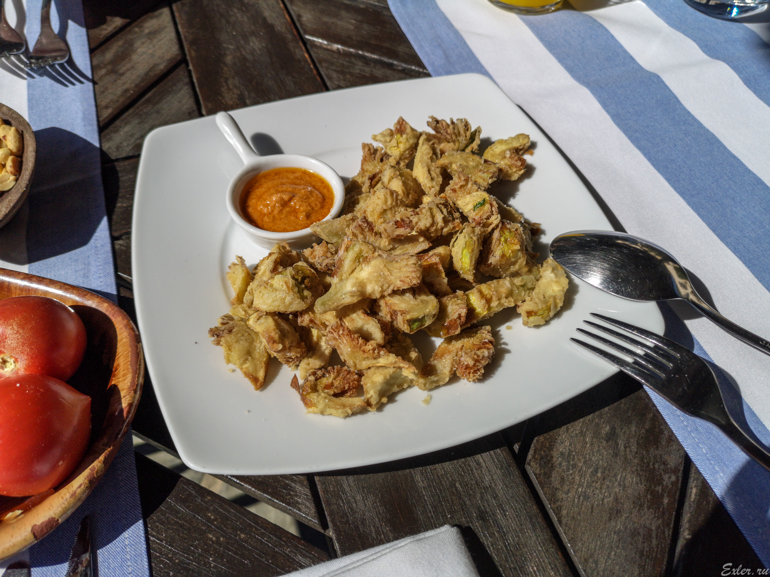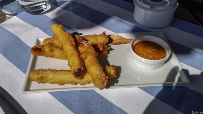 Признаюсь сразу - с кальсотом смалодушничали. Нам на выбор предожили традиционную подачу - это когда кальсот обжаривается на сухой виноградной лозе и потом так обугленный и подается на черепке или на газете, - а также уже приготовленный очищенный вариант. Мы взяли попробовать очищенный вариант, который, как выяснилось, вообще делается во фритюре.