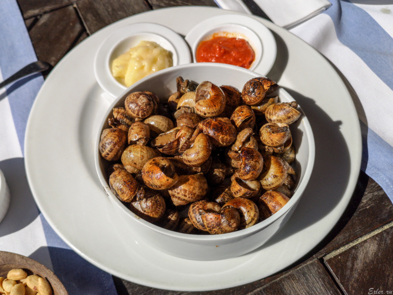 Некоторое время назад виноградные улитки (каракольес) были только моим любимым блюдом, а сейчас ими фанатеет вся семья. Причем везде интересно пробовать, потому что готовят их очень и очень по-разному. В данном случае их запекали в масляно-чесночном соусе, получилось очень вкусно и дополнительные соусы, на мой взгляд, вообще не были нужны. Хотя без них улитки были островаты, а соусы эту остроту приглушали.