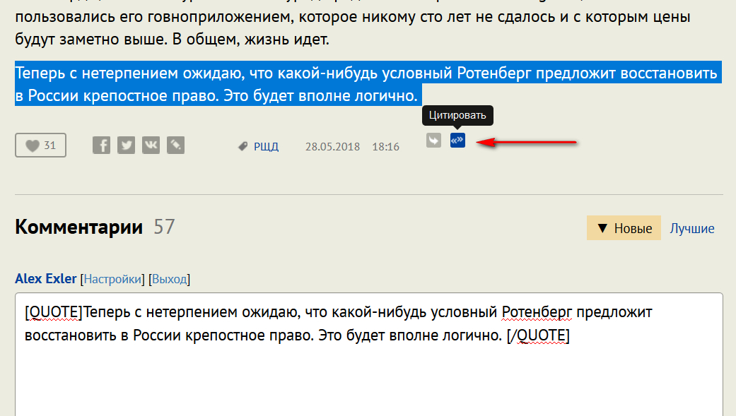 Добавили возможность цитирования записи блога - пиктограмма под записью справа. Для цитирования нужно выделить соответствующий текст и нажать кнопку. (Мы не стали делать, чтобы по умолчанию цитировался весь текст.)