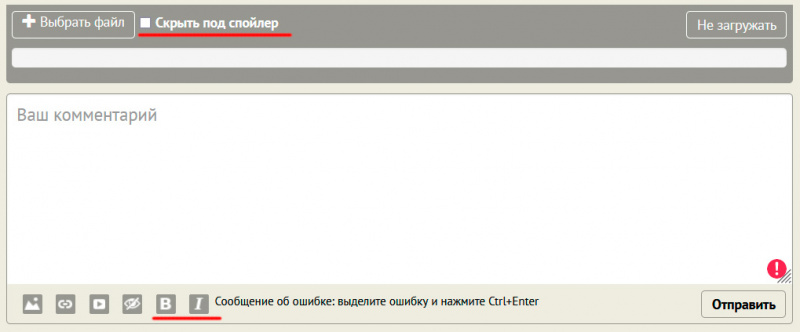 По просьбам трудящихся сделали возможность прятать в комментарии картинку под спойлер (опция при добавлении картинки), также сделали кнопки жирного (Bold) и наклонного (Italic) шрифтов, которые работают следующим образом: выделяете текст, нажимаете на нужную кнопку - движок проставит в тексте комментария соответствующие команды.