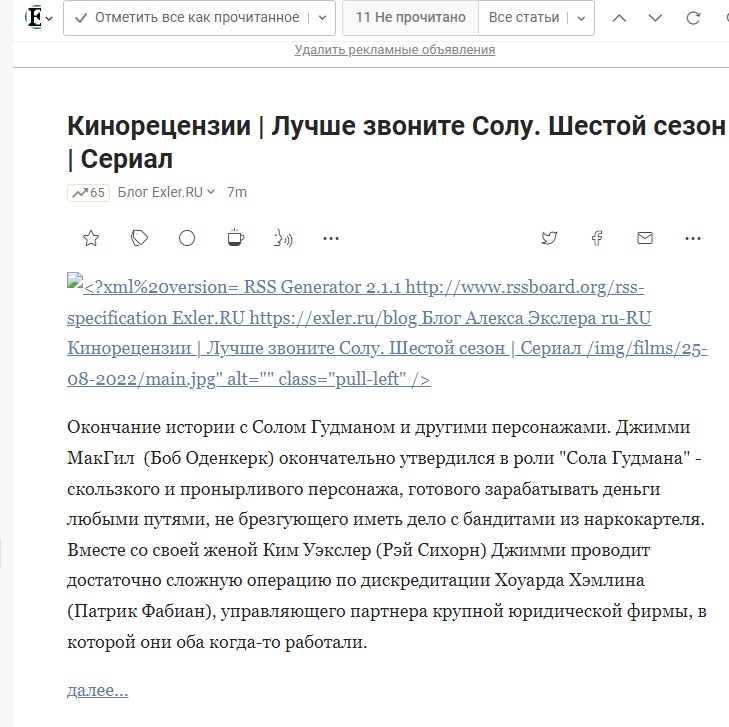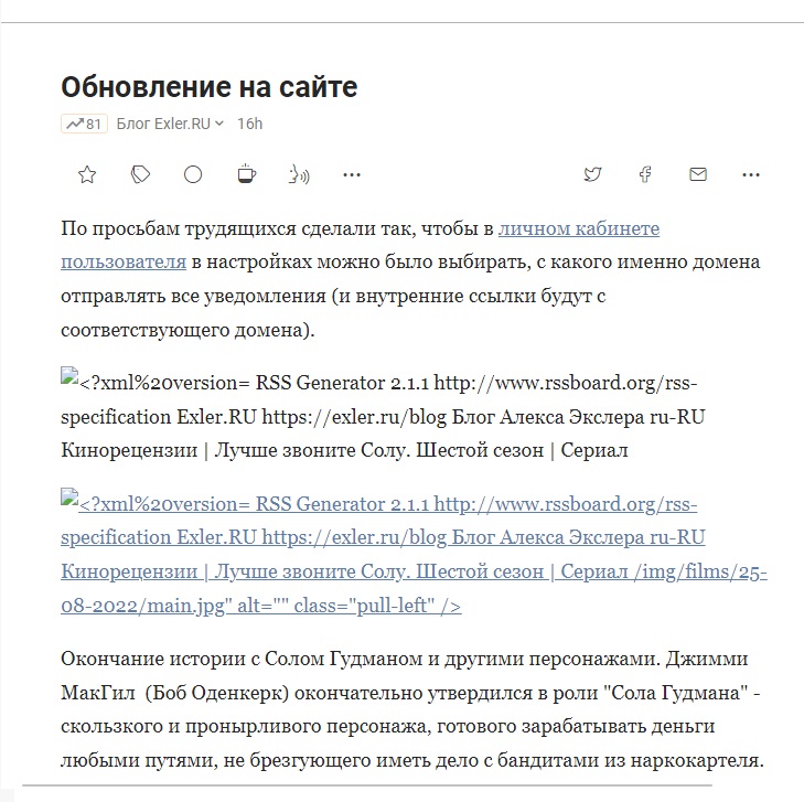 теперь через rss выглядит некрасиво - корявые ссылки, к хвосту новости подтягивает следующую новость, нет картинок (прикладываю скрины того, как теперь отображается лента в inoreader - два скрина после обновления, и один - до)