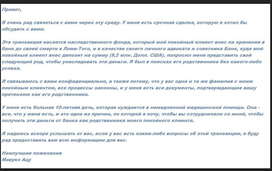 Я Альберт Вранкади, л,ичный а,двокат п,окойного г-на Кузнецов Михаила Александрович, гражданина вашей страны. который работал с строительная компания здесь, в Кот-д'Ивуаре. Он был моим клиентом. 21 апреля 2018 года Михаил попал в автомобильную аварию, все жители которой, к сожалению, погибли. С тех пор я сделал несколько запросов в ваше посольство, чтобы найти кого-либо из родственников господина Михаила, что оказалось безуспешным. и банк выдал мне уведомление, чтобы предоставить ближайшим родственникам возможность требовать средства на своем счете до того, как он будет конфискован или объявлен не обслуживаемым банком. После этих нескольких неудачных попыток найти родственников в течение более2 лет я решил отследить его средний имя в Интернете, чтобы н,айти любого члена его с,емьи. Я связываюсь с в,ами, чтобы попросить вашего согласия представить вам ближайших,родственников у,мершего, поскольку у вас о,динаковая средний имя, п,оэтому вам будут в,ыплачены с,редства в р,азмере €2,800,000.00 о,ставленные м,оим клиентом. Я г,арантирую, что это будет с,делано в соответствии с з,аконным соглашением, которое защитит вас от любого нарушения з,акона. У меня есть вся н,еобходимая и,нформация и юридические документы, чтобы вы