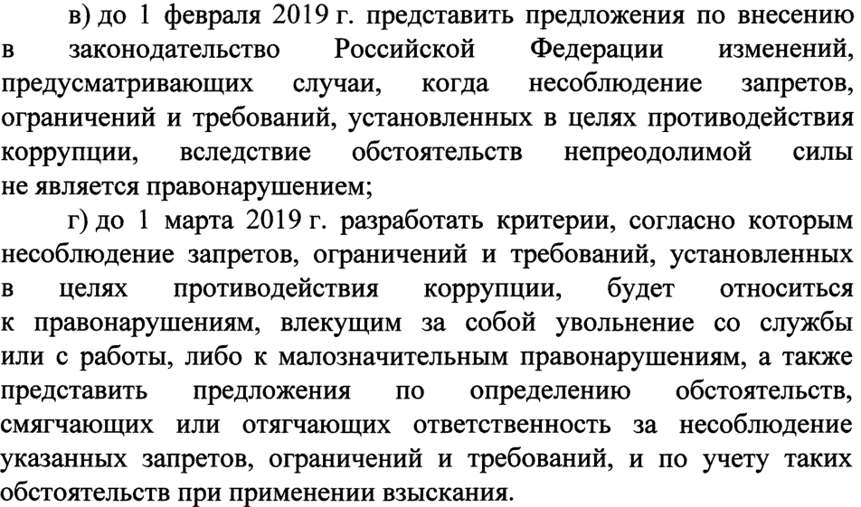 "в) до 1 февраля 2019 г. представить предложения по внесению в законодательство Российской Федерации изменений, предусматривающих случаи, когда несоблюдение запретов, ограничений и требований, установленных в целях противодействия коррупции, вследствие обстоятельств непреодолимой силы не является правонарушением."