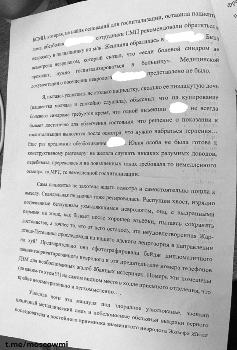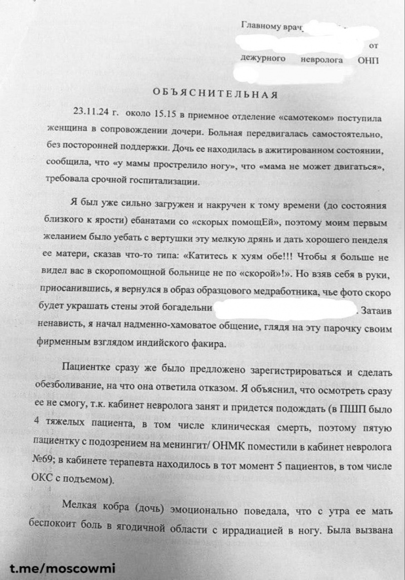 Мляяя! Если это правда и объяснительная настоящая, то я полностью на стороне невролога. Вы даже себе не представляете с какими ушлёпками медперсоналу приходится общаться, вот и не выдержал бедный невролог. Я не врач, но работая в больнице, имел радость быть оклеветанным не один раз. Хоть начальство и понимает где правда, а где поклёп, но после каждой жалобы приходилось давать объяснительные. Нет, карательных санкций никогда не следовало, но жалобщику ведь должны были дать ответ.