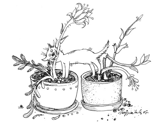 Судя по то му что все съедобные растения дома съедены, а цветочные горшки перешли в распоряжение маленьких хвостатых диверсантов, я делаю вывод что все в точности так как на картинках. Диверсанты были наказаны - и в результате я наблюдаю заключительный рисунок из приведенных на сайте. Четыре спины поглядывают на меня из самого дальнего угла комнаты в надежде что я все таки отвлекусь и не замечу что проигранная битва не означает проигранную войну.