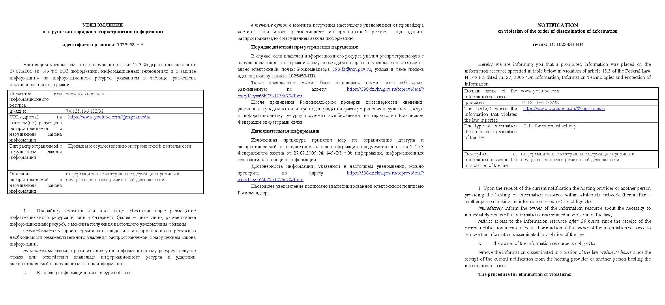 «Компания YouTube получила уведомление от Федеральной службы по надзору в сфере связи, информационных технологий и массовых коммуникаций (РОСКОМНАДЗОР) о том, что нижеуказанные материалы нарушают Федеральный закон Российской Федерации № 149-ФЗ “Об информации, информационных технологиях и о защите информации”. Роскомнадзор добавил следующий URL адрес (адресa) в запрещенный список материалов. Для получения дополнительной информации Вы можете посетить следующий сайт http://eais.rkn.gov.ru/ Если Вы не удалите контент, компания Google может быть вынуждена заблокировать контент.
