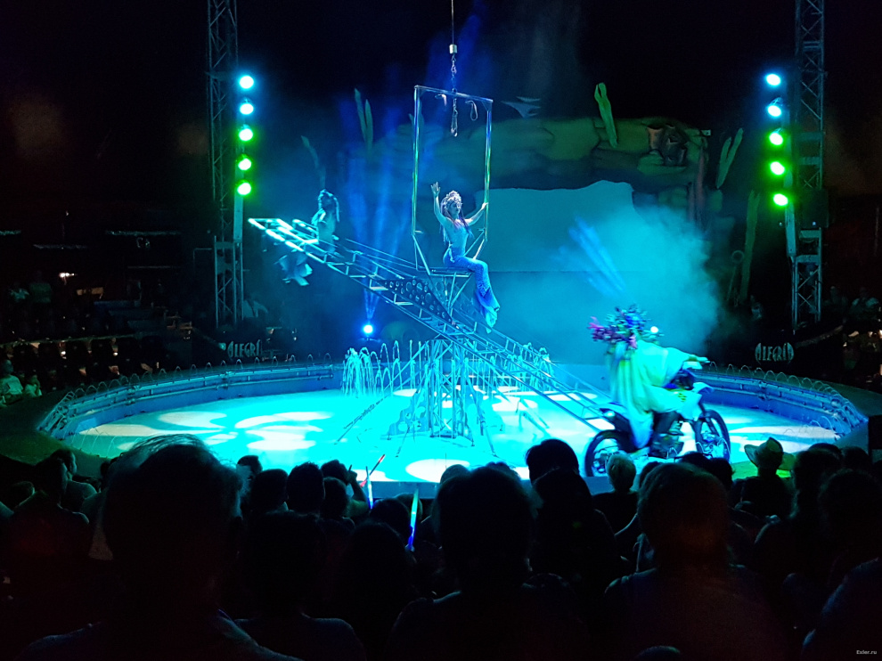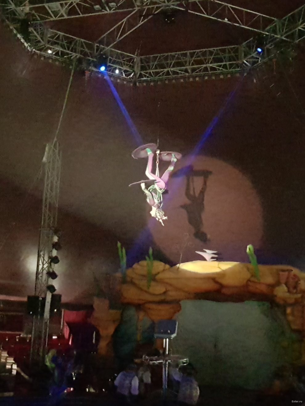 Еще один традиционный номер с воздушными акробатами. Что нас страшно удивило: сначала дама залезла на эту подвеску и с арены подхватила мужика - обычно бывает наоборот. Но потом она опомнилась и они поменялись местами.
