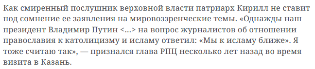 Т.е. РПЦ решила потихоньку кооперироваться с исламом. Это интересное начало, ждём, когда Кадырова-младшего сделают каким-нибудь попом, а Кадыровых-старших объявят святыми.