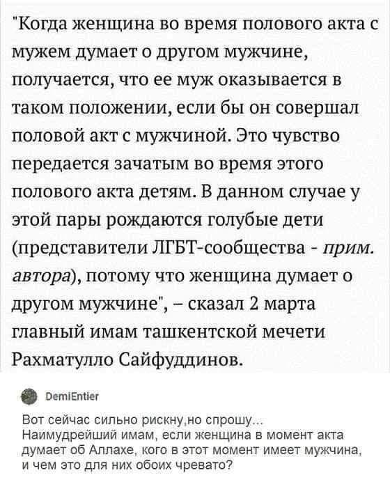 В Мордоре теперь попы читают преподавателям образовательный курс по этим "традиционным ценностям" и объясняют, что ежели, значить, баба надела юбку выше колена, и ее при этом изнасиловали, то она сама виновата. И что в Мордоре женщины должны одеваться так, чтобы "не вызывать недоумение у приехавших с Кавказа". Кстати, интересно, а, по мнению попов, женщины этим "приехавшим с Кавказа" не должны минет делать, а? Ну, просто интересно. А что еще должны делать русские люди, чтобы не вызывать недоумение у приехавших с Кавказа? Хочется полный список.