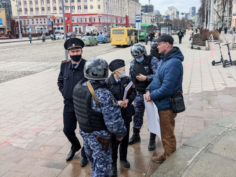 В Екатеринбурге на одиночном пикете задержали мужчину, у которого был плакат с фразой: "Войной легче прикрывать свои провалы в экономике и социальной политике, легче вести ограбление своего народа и государства". (Отсюда.)