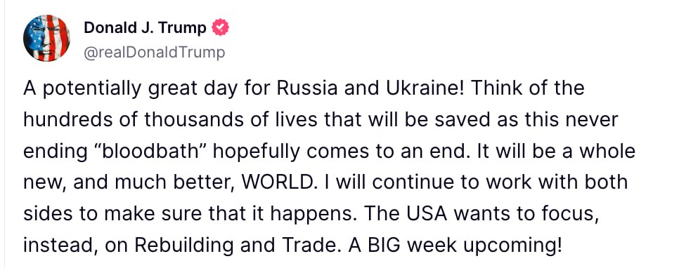 Трамп: "Потенциально великий день для России и Украины!" То есть, украинцев продолжат убивать, но под звуки болтовни в Стамбуле, какая великая разница.
