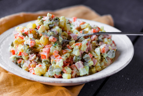 Вроде бы можно выдохнуть с облегчением и положить себе в тарелку салат, но тут вступают в силу законы комбинаторики. Дело в том, что продукты, входящие в классический рецепт оливье, не слишком хорошо ладят друг с другом. Картофель с мясом или колбасой — плохое сочетание, с майонезом — еще хуже, с яйцами — пищевая бомба. Белковая и углеводная пища переваривается разными отделами пищевода и желудка, в разное время, и для этого требуются разные ферменты. А если опустить в ЖКТ все это одновременно в виде пестрой салатной смеси, то организм просто запутается, какому ферменту включать зеленый свет и каким отделам пищеварительного тракта поручать обработку такой пищи. К тому же оливье традиционно подается в мелкой нарезке, поэтому быстро отделить одно от другого и организовать правильную транспортировку отдельных составляющих наша система переработки продуктов будет не в силах.