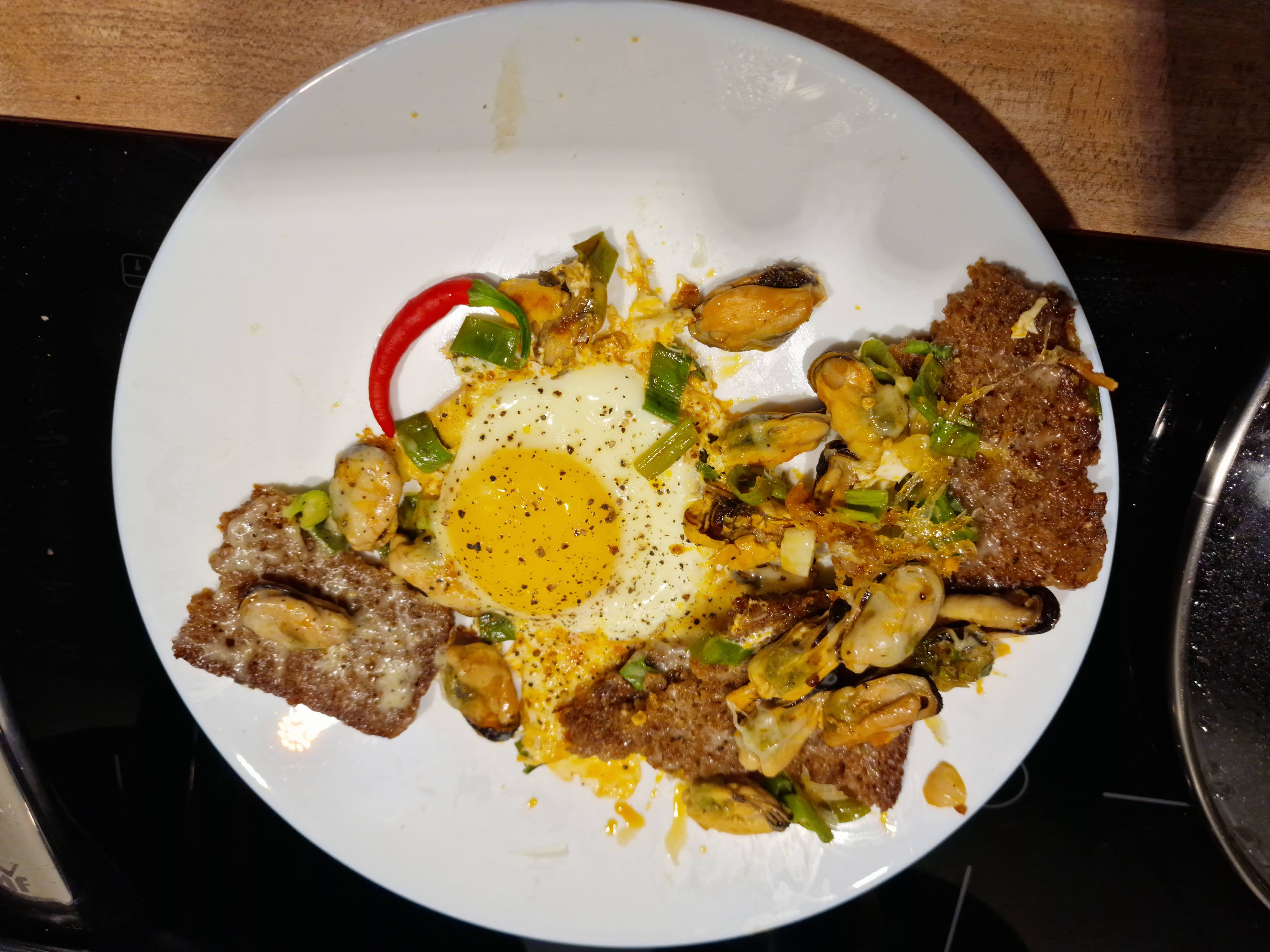 - глазунья с хрустящей корочкой и жидким желтком (жарю быстро на достаточно сильном огне, поливая сверху горячим маслом из той же сковороды)