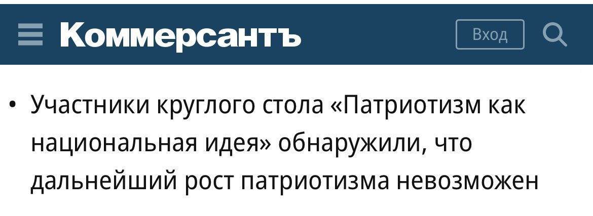Вот и мечутся, болезные, ищут идею. На данный момент типа как нашли - патриотизм. Типа как это должно быть национальной идеей. Но что они подразумевают под "патриотизмом"? Слепо верить в царя-батюшку, слепо верить его пропагандонам, не сметь критиковать его чиновничье ворьё, изо всех сил прославлять войну с Украиной и гордиться этим "воинством поганым", которое в Украине, конечно же убивает, насилует и пытает, но и их самих ВСУ успешно утилизирует. А кого не сумели утилизировать, те возвращаются в РФ, где убивают, насилуют и пытают, а патриоты должны в этом отребье видеть "новую элиту", ибо так царёк повелел.