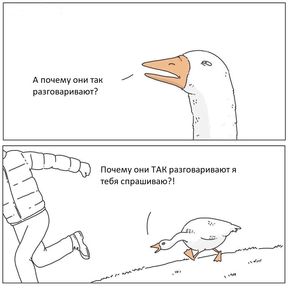 Кстати, гуси не такие страшные, как кажется. На меня как-то напали сзади, ущипнув за жопу, и продолжали крылья распускать. Надо дать им пинка за это, и они успокаиваются.