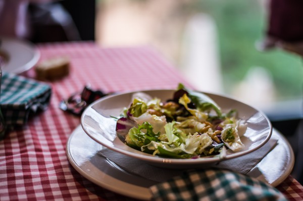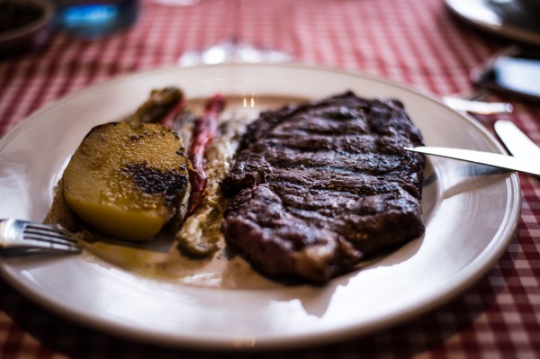 У нас времени было очень мало, поэтому заказали по салату и антрекоту. Взяли бутылку приличного белого вина.